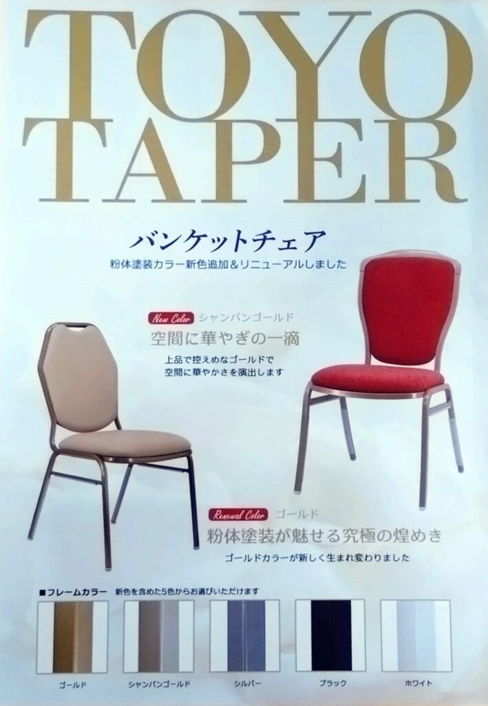 Oxyplastブランド粉体塗料をご採用頂いた東洋工芸様が国際ホテルレストランショーにバンケットチェアを展示されました。ゴールドメタリックとシャンパンゴールドをほどこし、よりきらびやかで豪華な仕上りになっています。